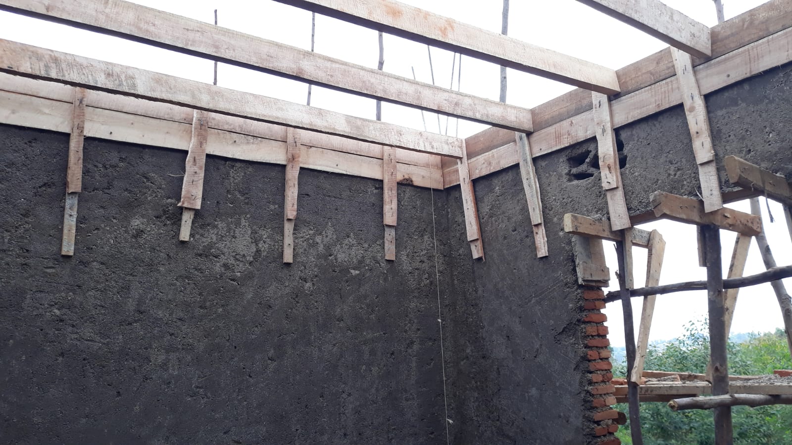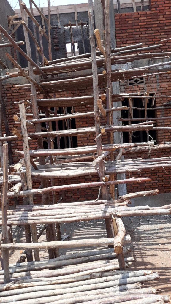 Rosną mury ku uciesze dzieci, bo wiele z nich nie może się uczyć ze względu na brak miejsca. Przygotowujemy słupki i deski pod wylanie sufitu.